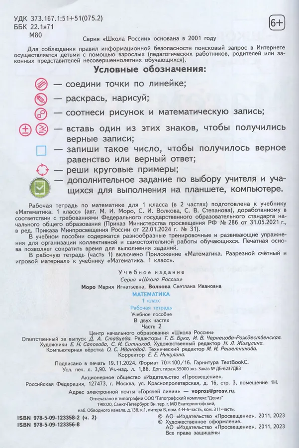 Рабочая тетрадь по математике для 1 класса (в 2 частях) подготовлена к учебнику "Математика. 1 класс" (авт. М.И. Моро, С.И. Волкова, С.В. Степанова), доработанному в соответствии с требованиями Федерального государственного образовательного стандарта начального общего образования (Приказ Министерства просвещения РФ № 286 от 31.05.2021 г., в ред. Приказа Минпросвещения России от 22.01.2024 № 31).