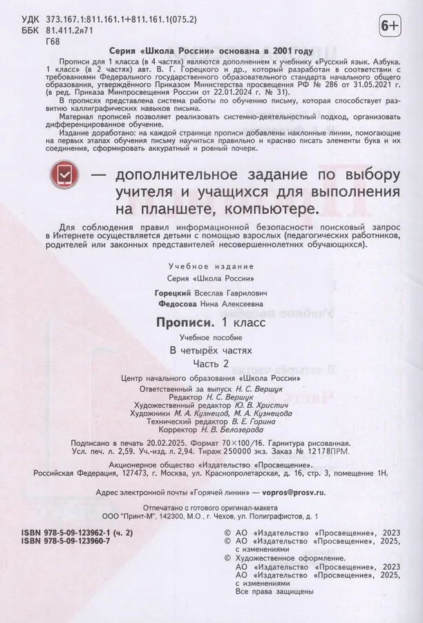 Издание доработано: на каждой странице прописи добавлены наклонные линии, помогающие на первых этапах обучения письму научиться правильно и красиво писать элементы букв и их соединения, сформировать аккуратный и ровный почерк. Прописи для 1 класса (в 4 частях) являются дополнением к учебнику «Русский язык. Азбука. 1 класс» (в 2 частях) авт. В. Г. Горецкого и др., который разработан в соответствии с требованиями Федерального государственного образовательного стандарта начального общего образования, утверждённого Приказом Министерства просвещения РФ № 286 от 31.05.2021 г. (в ред. Приказа Минпросвещения России от 22.01.2024 № 31). В прописях представлена система работы по обучению письму, которая способствует развитию каллиграфических навыков письма.